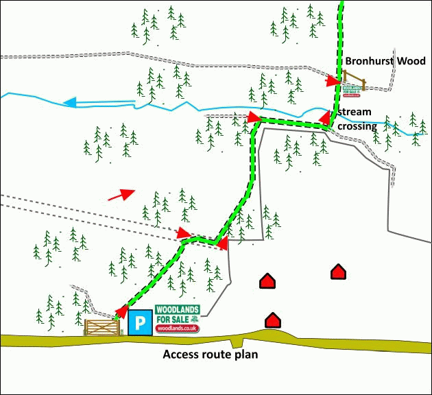 Access to Bronhurst Wood is via a wooden gate off Battle Road (the new owner will be provided a key for this locked gate). A track leads through woodlands to the ride stop entrance to Bronhurst Wood. Here owners can drive in and park a car within the wood itself.