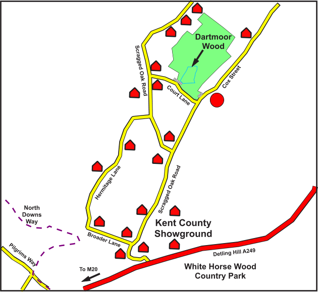 Please note, for satellite navigation, use the post code ME14 3HF. This will take you to within approx. 0.5 miles of the main entrance gates to Newlands Wood (of which Dartmoor Wood is a part) as shown by the red dot on the map. Coordinates to the main gates leading to Dartmoor Wood (off Court Lane) are: N51.313599, E0.584996. To find the wood follow the instructions below.