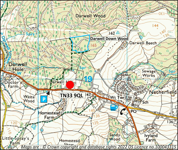 Darwell Down Wood at Darwell is just west of Netherfield and about 4 miles northwest of Battle in East Sussex. Click here for Bing Maps Directions enter your own postcode, (the coordinates of the entrance gate are already entered). Park to one side of the gate so that others can access the entrance. For Satnav: the nearest postcode is TN33 9QL as shown by the red dot on the maps. Coordinates for your satnav are N50.944301, E0.420425.