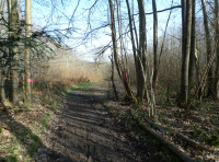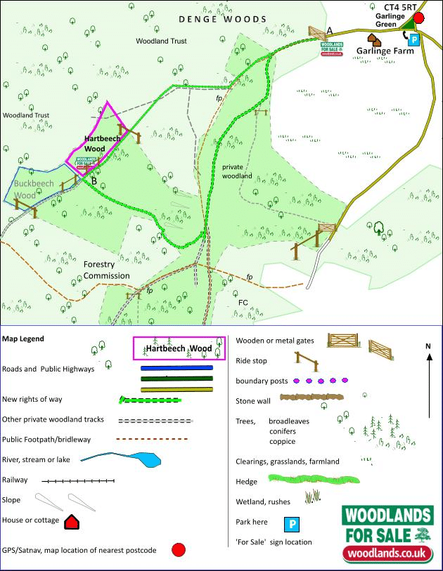 Access to the ridestop entrance on the southern boundary of Hartbeech Wood is over ¾ mile along a private forest track, A-B on the plan, although a fair distance it is a very pleasant walk. There is a full right of way in perpetuity, from the public highway in Garlinge Green (by gate A). The track leaves the public highway at gate A then for about 900 metres it then passes through the main woodland down to the valley bottom, here there is a sharp right turn and for 250 metres the track passes though chestnuts up the slope of the valley side, round to the right by the Foresty Commission's woodland and comes out into an opening. Here the track turns left and for about 270 metres winds through mature woodland until coming to another track. Hartbeech Wood is just to the right on the left side. The access is good for normal family car for most of the year, although a 4X4 would be preferable in the winter.