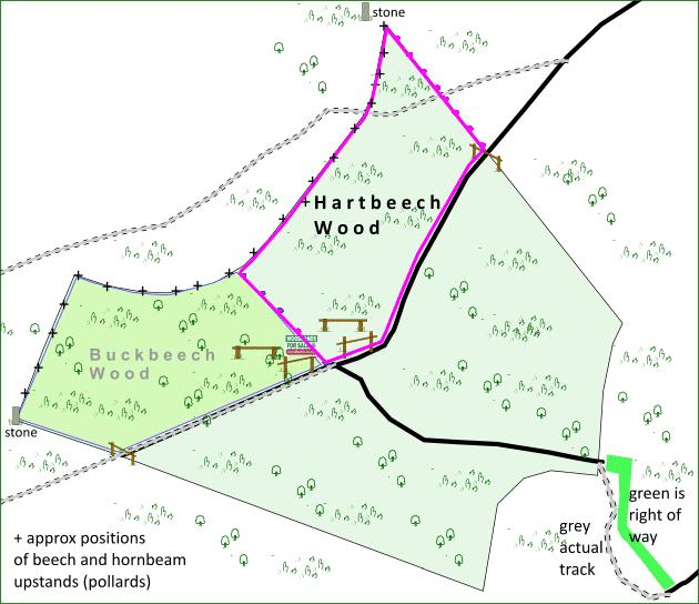 These are shown with mauve markings and are on free-standing posts or on boundary trees. The boundaries are to the southeast alongside the track, to the southwest there are free-standing posts (blue one side mauve the other), to the northwest there are marked trees, mostly pollarded hornbeam or beech, and to the northeast there are free-standing posts with mauve markings.