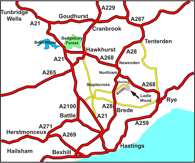 Ladle Wood lies to the south of the village of Beckley and is approximately 3km west of the village of Peasmarsh and approx. 7 miles north from the coastal town of Rye. The woodland sits within the High Weald Area of Outstanding Natural Beauty (AONB).