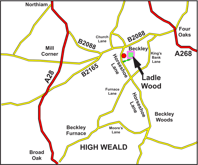Please note, for satellite navigation, use the post code TN31 6SD. This will take you to within approx. 50 meters of Milldown Wood (of which Ladle Wood is a part) as shown by the red dot on the map. Coordinates to the main entrance gate leading to Ladle Wood (off Horseshoe Lane) are: 50.97882, 0.62901. To find the wood follow the instructions below.