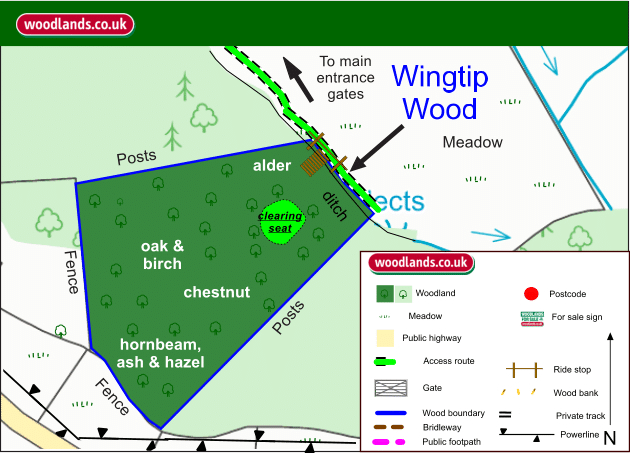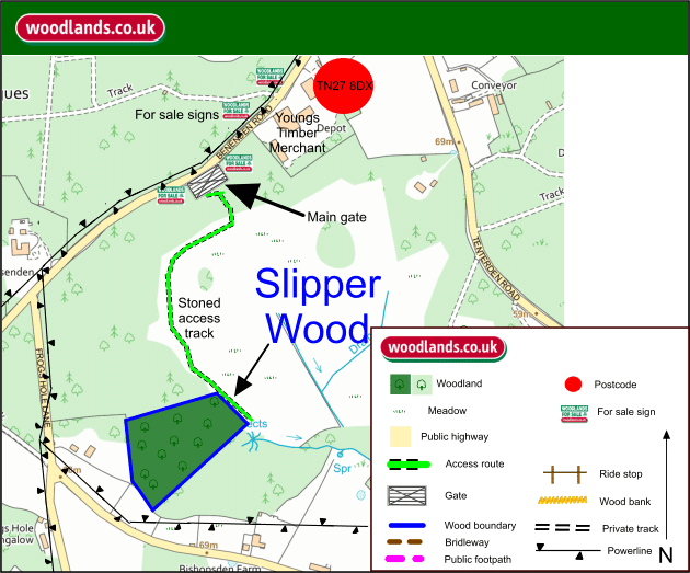 Slipper Wood is situated approx. 3km south-west of Biddenden and 4km north-east of Benenden in the county of Kent. A private stoned track on the edge of open meadows provides access to the wood. There is a place for a new owner to park within the wood itself. Just beyond the ride stop a footbridge has been installed across the shallow ditch to reach the woodland. There is stock fencing along the edge of the woodland (from when livestock were previously grazing the meadows). A short section of fencing has been opened up to allow easy access into the woodland. The southeastern and north facing boundaries are marked with a line of chestnut fencing posts. The west facing boundaries are fenced. Boundaries are clearly marked with BLUE markings.