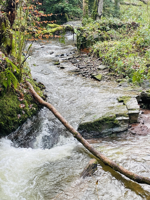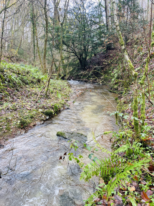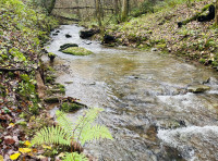 There is a small area of level ground in the southern sector of the woodland, with a forest path running along ten metres or so inside, roughly parallel with the southern boundary. There is a small glade here providing space for a working area and possibly a shelter for cups of tea and storage for tools. A short distance northward from here, the ground falls away fairly steeply down towards the brook which runs along the bottom of the valley. Mature oak, chestnut and beech populate this area, with shrub sized holly and hazel between, some of which has been coppiced, and an open forest floor with many ferns and various wildflowers throughout the year. A narrow footpath descends diagonally to the bottom of the slope in the north eastern corner of the woodland, bringing you to the southern bank of Millhalf Brook.