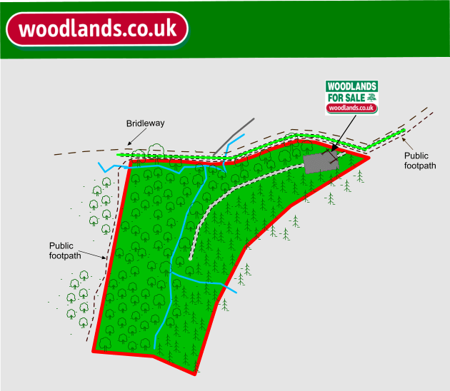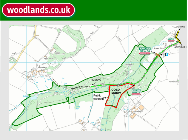 From Newcastle Emlyn take the A484 towards Cenarth. At Cenarth take the left turn just after the Three Horseshoes pub, signposted B4332. Follow this winding road for a few miles, until the road crosses the Afon Cych and turn RIGHT on the sharp bend into the village of Abercych. Follow the road through Abercych, and just before you leave the village, take the left turn BEFORE you go over the small stone bridge. Look out for a bridleway sign, and a small Woodlands for Sale arrow sign at the beginning of the turn off.