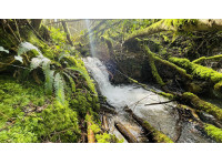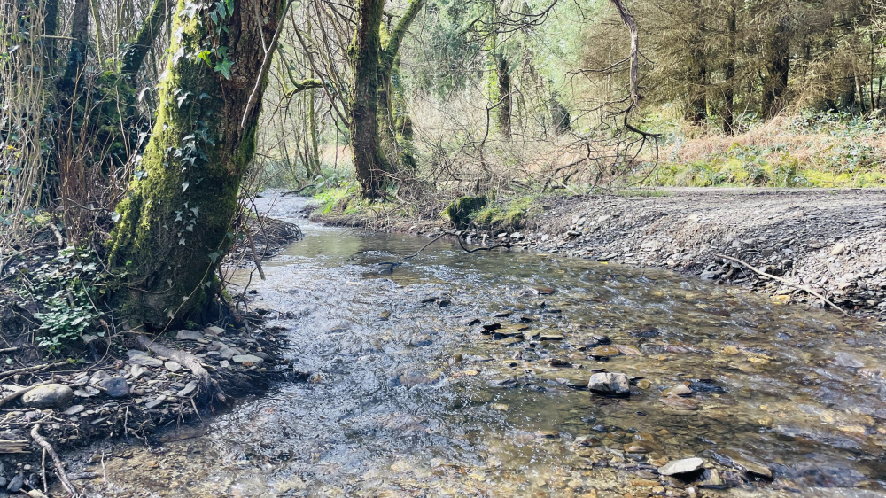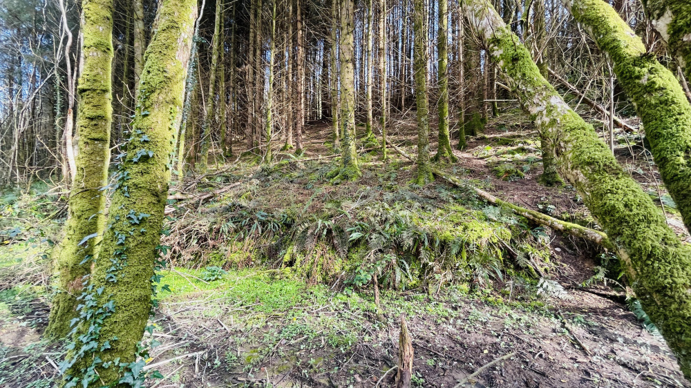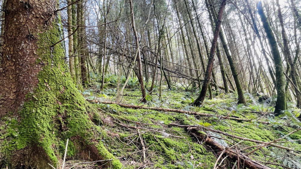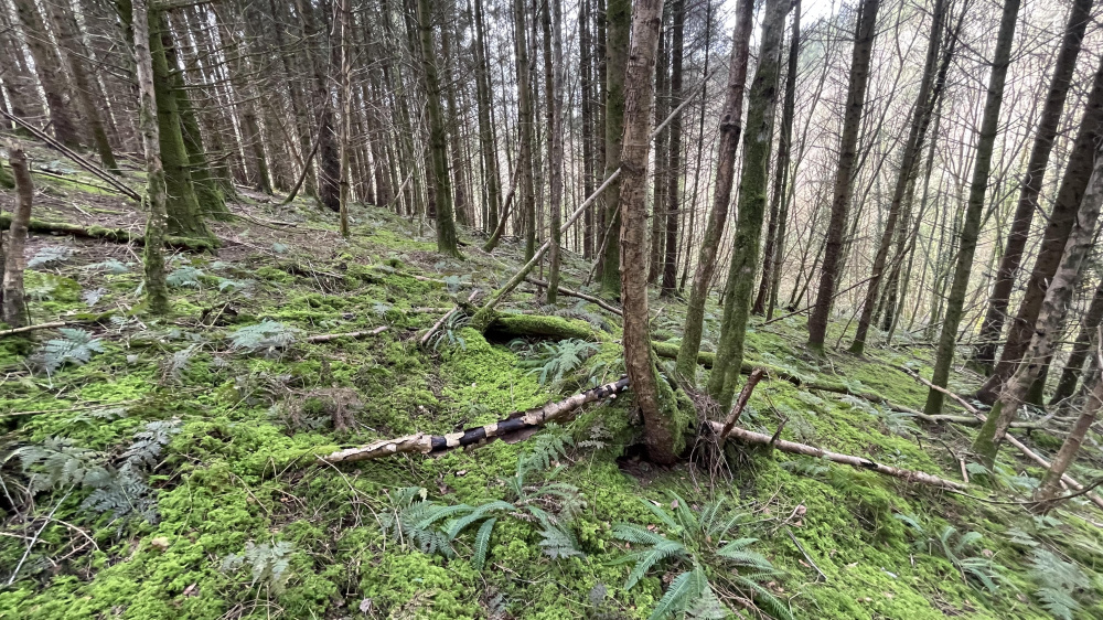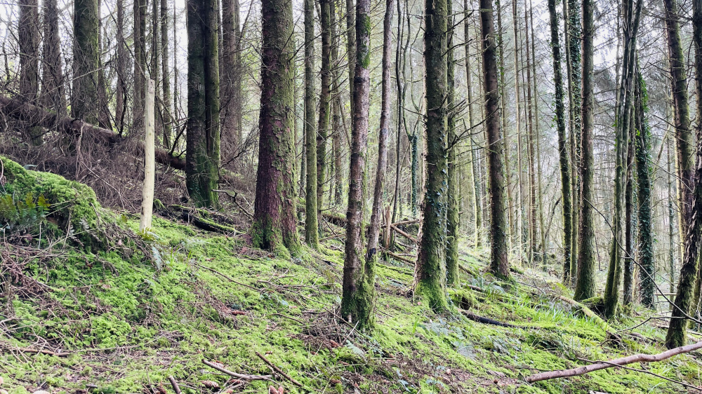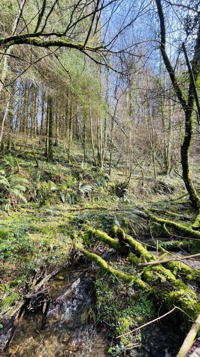 Coed Morw, a mixed woodland of Sitka spruce, Douglas fir and mixed age broadleaf over varied terrain with two bubbling streams and an area of crisscrossing springs.