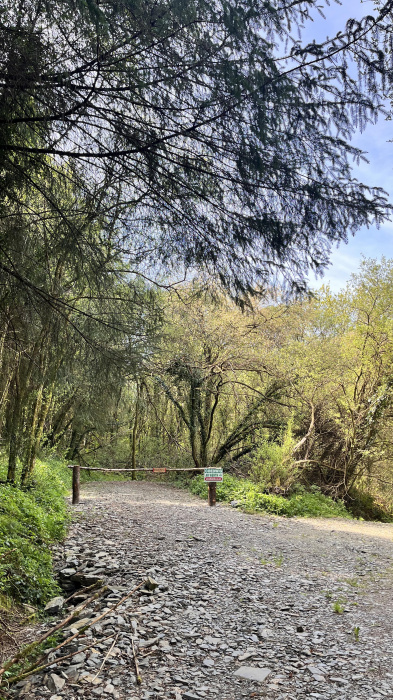 There is easy vehicle access to Coed Morw. A long, stoned track brings you from the public road into the larger woodland, Gallt Sena, via the locked main entrance gate and continues to the entrance to Coed Morw where there is a large level stoned area ideal for stacking wood or parking a camper van.