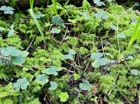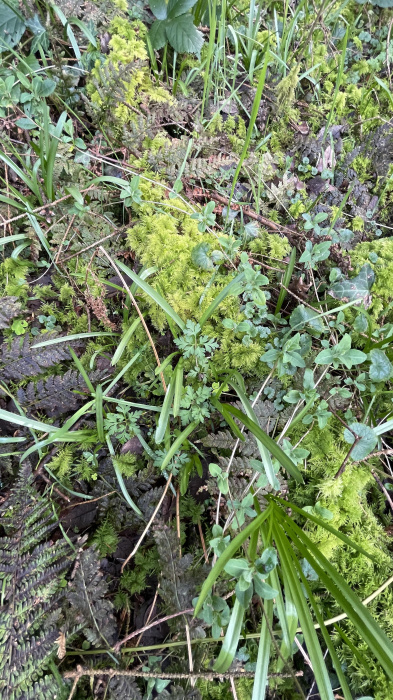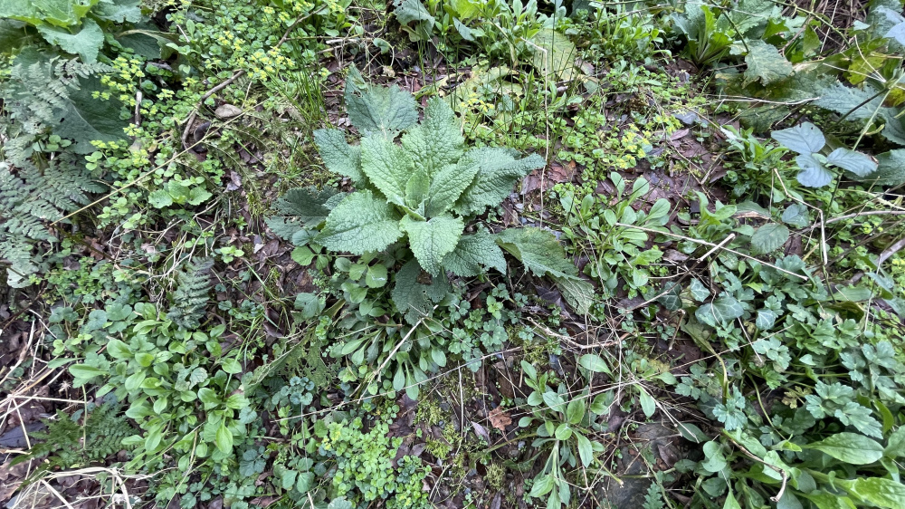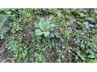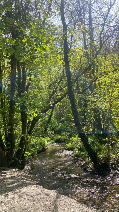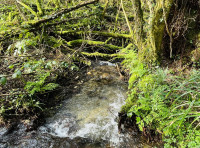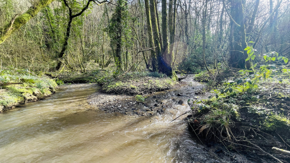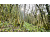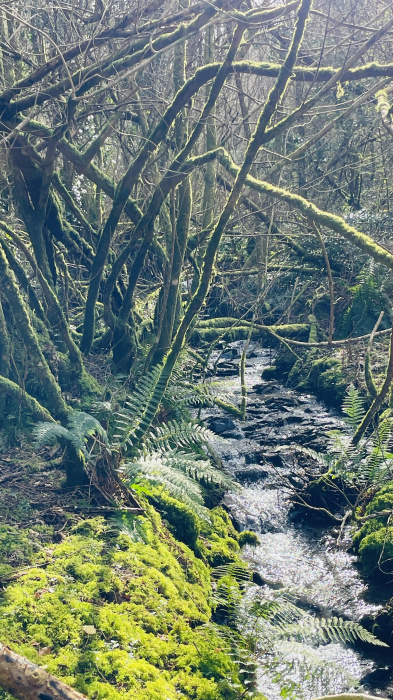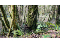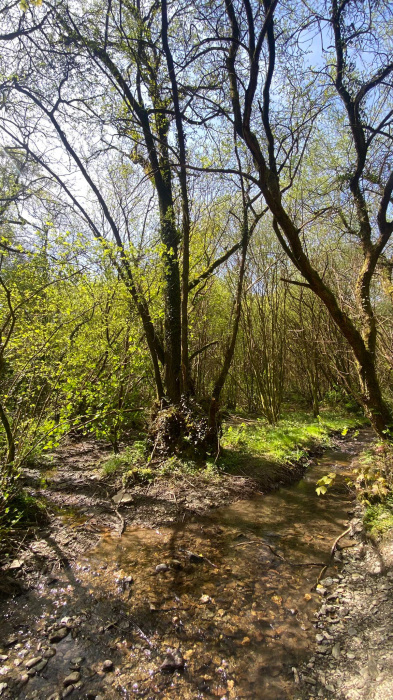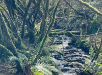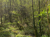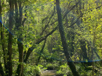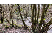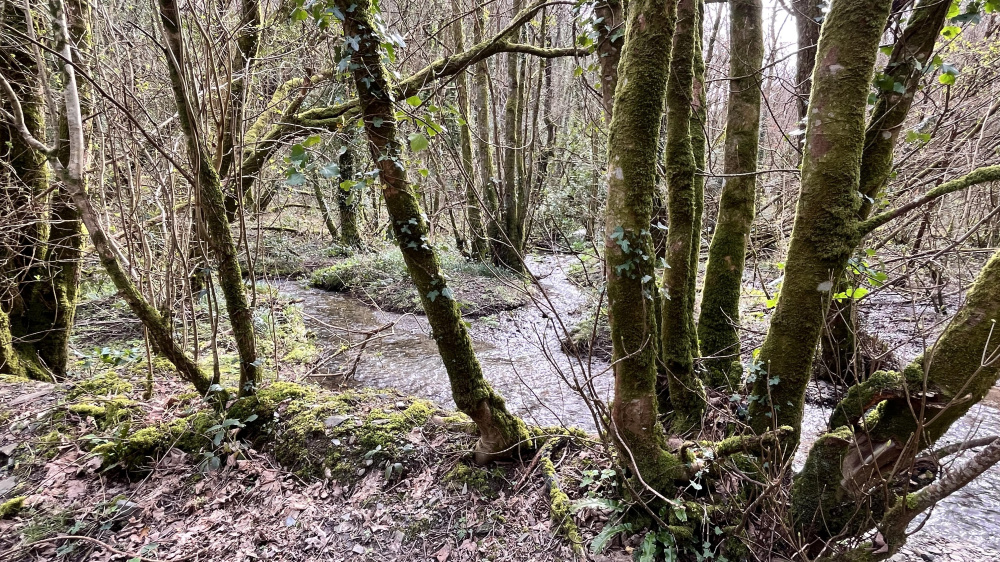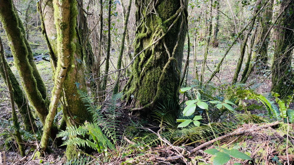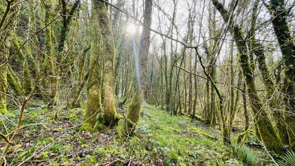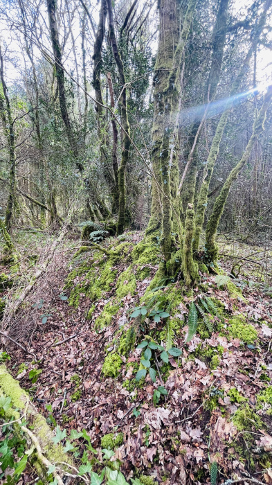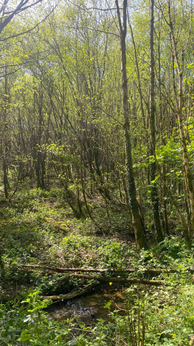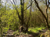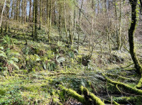 The west side of Coed Morw is made up of young broadleaf, mostly multi stemmed and coppicing would be an ideal method of woodland management to continue for Coed Morw. It is great for biodiversity and the long-term sustainability of broadleaf woodlands. There are mature specimens of oak, birch and sycamore also throughout the woodland and on the forest floor there are a multitude of wildflowers, bluebells, oxalis - an ancient woodland indicator, celandine, golden saxifrage which loves the wet ground, amongst many species of ferns and mosses and masses of honeysuckle twining up. Clumps of angelica thrive in the wet habitat along the stream banks. The ground slopes up gently towards the southern boundary on the west side of the stream, and between the dense young growth there is the opportunity to create one or two small clearings to bask in the birdsong and take in the beauty of the surrounding nature.