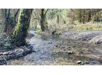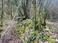 The east side is predominantly Sitka spruce, planted on a north-facing slope but not too steep to navigate easily and the Sitka are well spaced. An old trackway cuts through the woodland from its entrance, following the contour of the slope around in a curve and continuing towards the southern boundary. Following this track in a westerly direction, the ground slopes up fairly steeply on the left-hand side with more well spaced Sitka. To the right of the track, which is predominantly broadleaf trees, the ground becomes very soft underfoot as the Nant Morw, which runs down from the southern boundary, splits into many small rills crisscrossing the lower level of the woodland. These in turn feed into the large stream which runs along the northern boundary and exits the woodland via a large culvert under the track at the midpoint of Coed Morw.