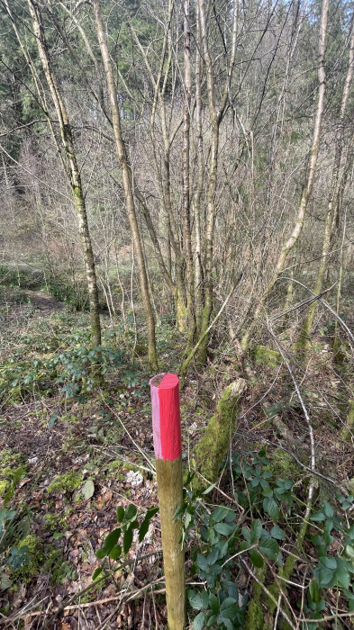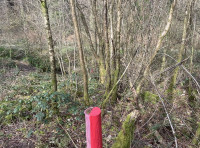 The boundaries of Coed Morw are marked with red paint on wooden marker stakes, trees and fence posts.