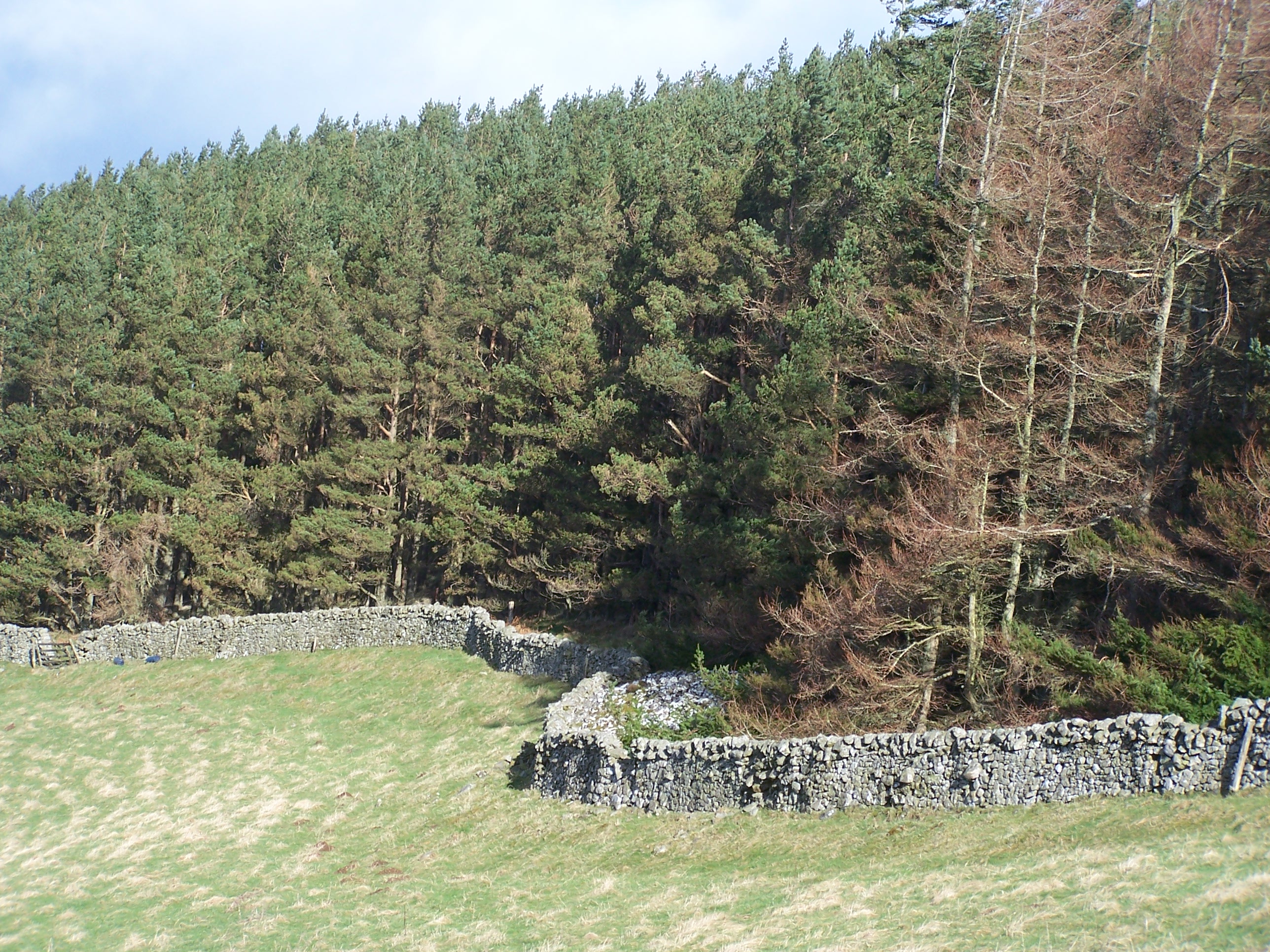 | photo, woodland, image, tree, feature, boundary, wall, stone wall, conifer, coniferous, larch, dry stone dyke, woodlands.co.uk, |