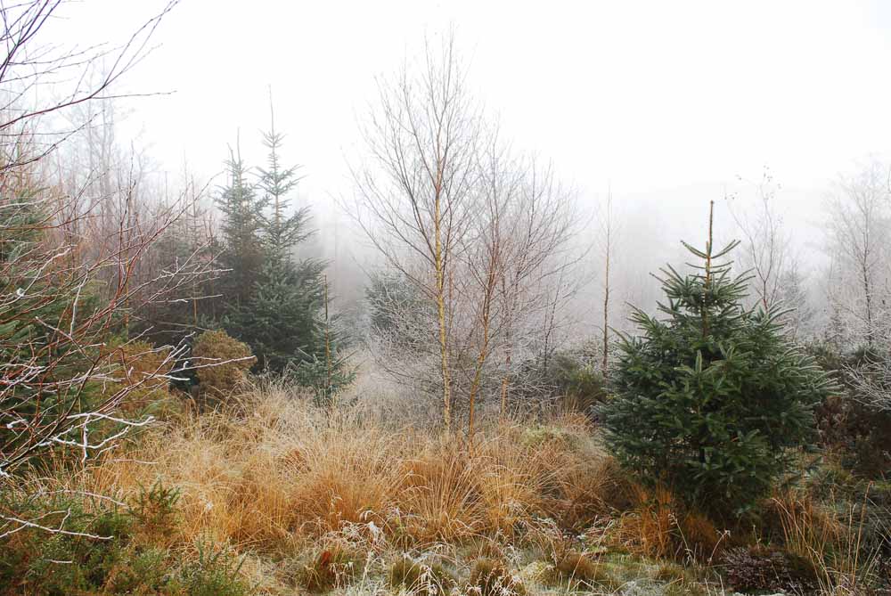 | photo, woodland, image, tree, plant, shrub, deciduous, mist, misty, frost, conifer, coniferous, spruce, birch, woodlands.co.uk, |