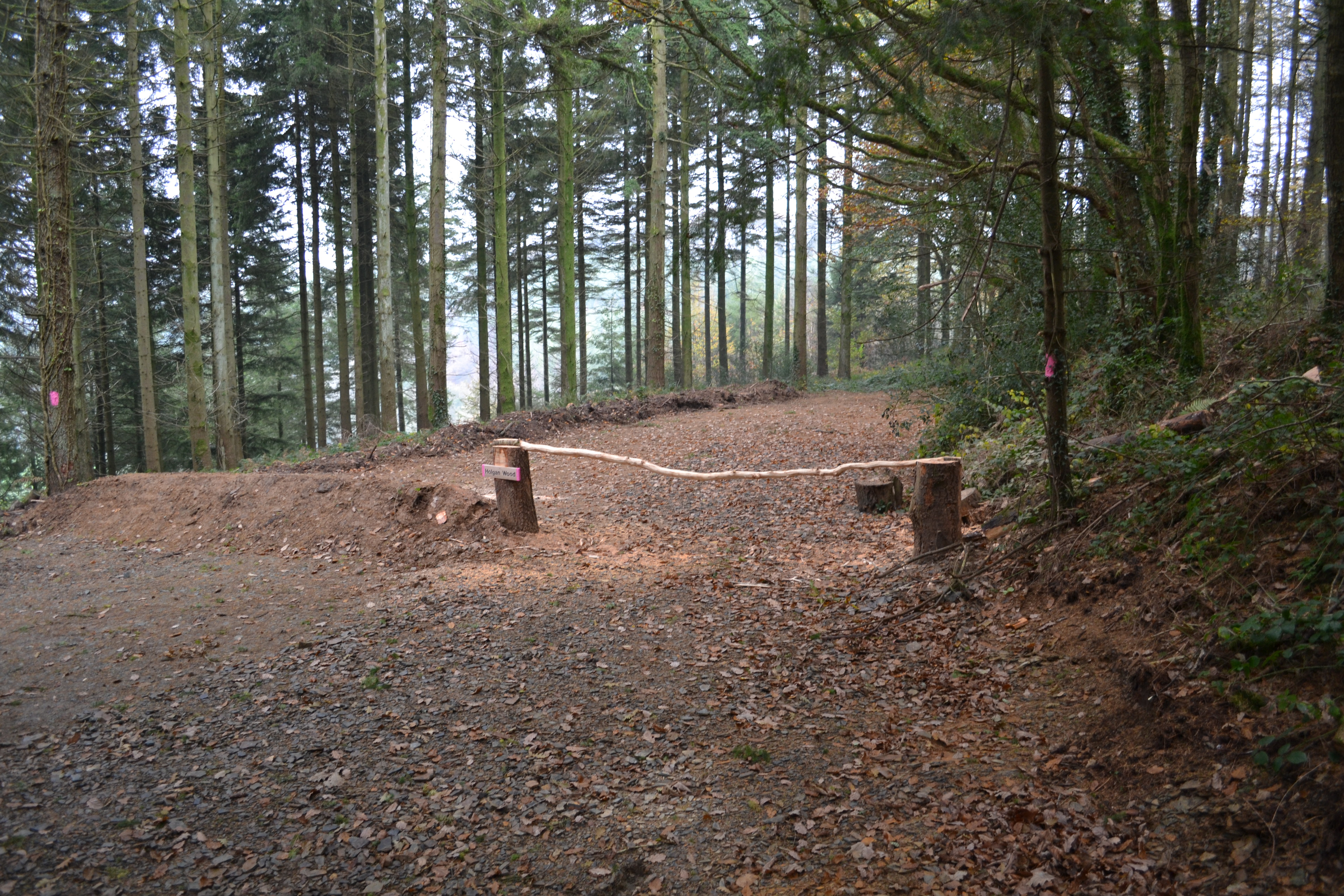 | photo, woodland, image, clearing, tree, feature, road, gate, signage, sign, path, ride stop, conifer, coniferous, larch, japanese, woodlands.co.uk, |