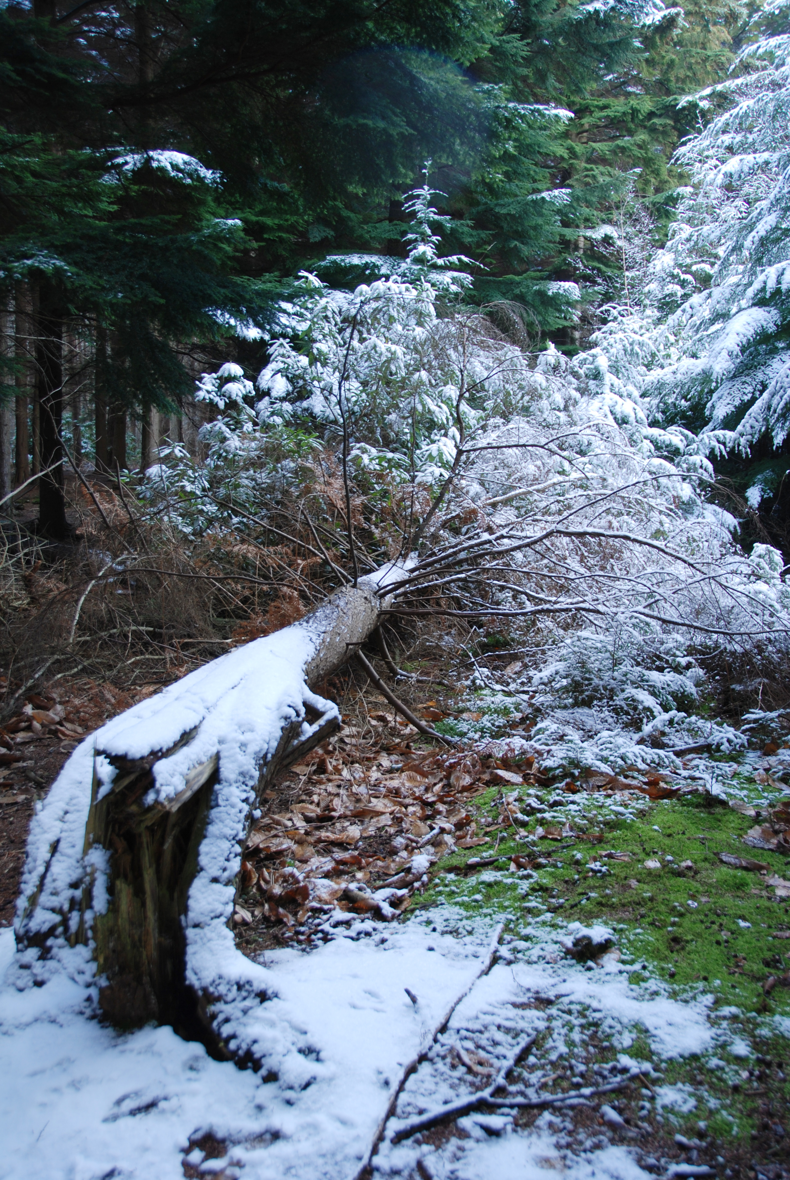 | photo, woodland, image, tree, snow, winter, conifer, coniferous, pine, dead, broken, woodlands.co.uk, |