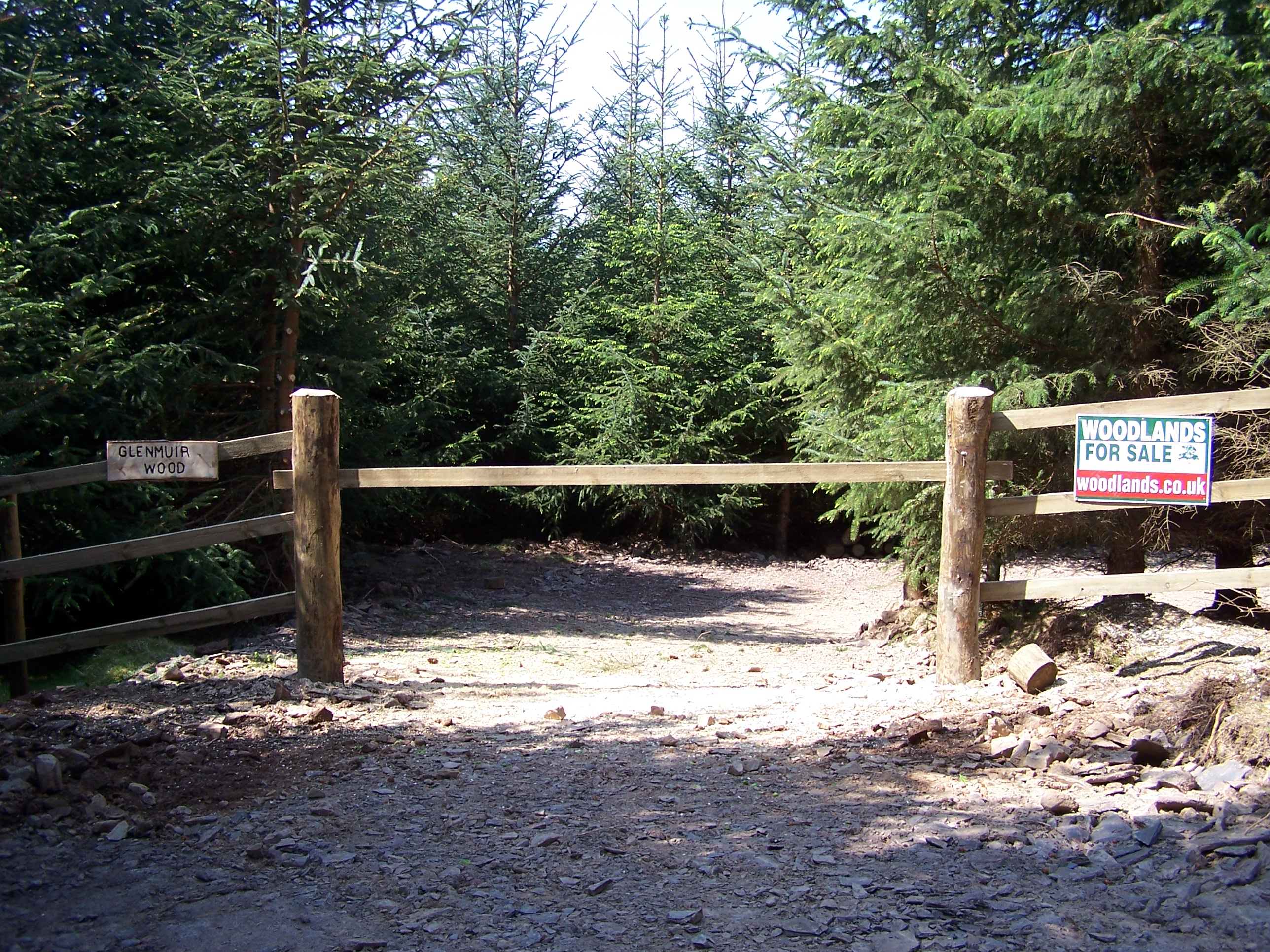 | photo, woodland, image, tree, feature, road, gate, fence, signage, woodlands signage, sign, boundary, ride stop, conifer, coniferous, spruce, woodlands.co.uk, |