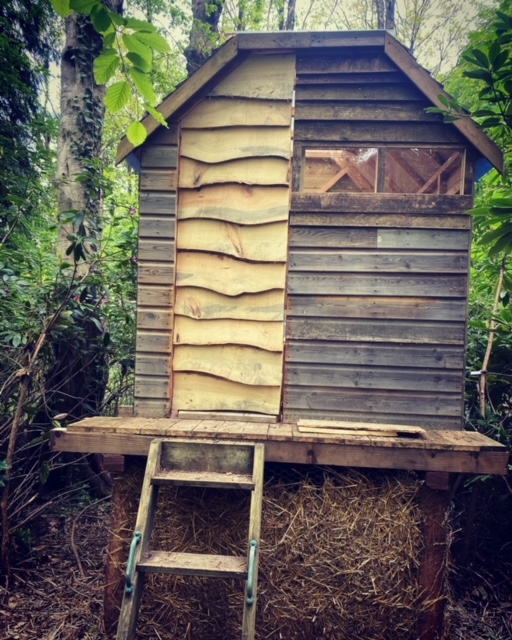 “We started with a 1 metre cubed platform with a hole in the top, with straw-filled chicken wire wrapped around to conceal ‘the contents’. Then we added a set of slightly wonky steps (adds character). Having realised we didn't have skills enough for the building from scratch, we purchased a tiny shed which proved challenge enough to build 1 metre in the air. A box seat was topped off with the recycled toilet seat that had belonged to my Mum (she had died a few months previously). Fairy lights completed the inside and we added a nest box and bat box to the exterior. Two years on we are still very pleased with it and it has needed very little maintenance.”